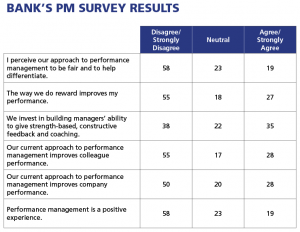 “All the evidence from our performance management survey points to an uncomfortable truth for the Bank: in almost every area line managers had an equally unfavourable view of the performance management system than staff, from its usefulness to its ability to drive high performance.