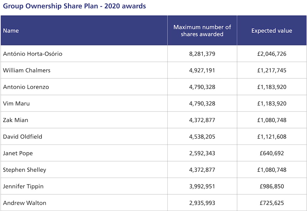 If 2020 was so bad that Lloyds can’t afford to give staff any GPS awards, then we would expect it to announce that there will be no Group Ownership Share Plan awards for senior executives. If there are no bonuses for staff but massive share options for executives, then that will tell you all you need to know about the priorities of the bank. Last year awards for the 2019 performance period were made on 5th March 2020. The awards were as follows: